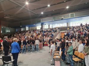 V nadaljevanju se je predsednica srečala z učenci, zbranimi v šolski telovadnici. Osrednji del obiska je bil namenjen odprtemu pogovoru z učenci, ki so s svojo neposrednostjo in iskrenim zanimanjem ustvarili sproščeno in vsebinsko bogato razpravo. Zanimalo jih je tako osebno kot poklicno življenje predsednice – od njenih otroških želja in prve zaposlitve do vsakodnevnih navad, bralnih interesov in osebnih zanimanj.